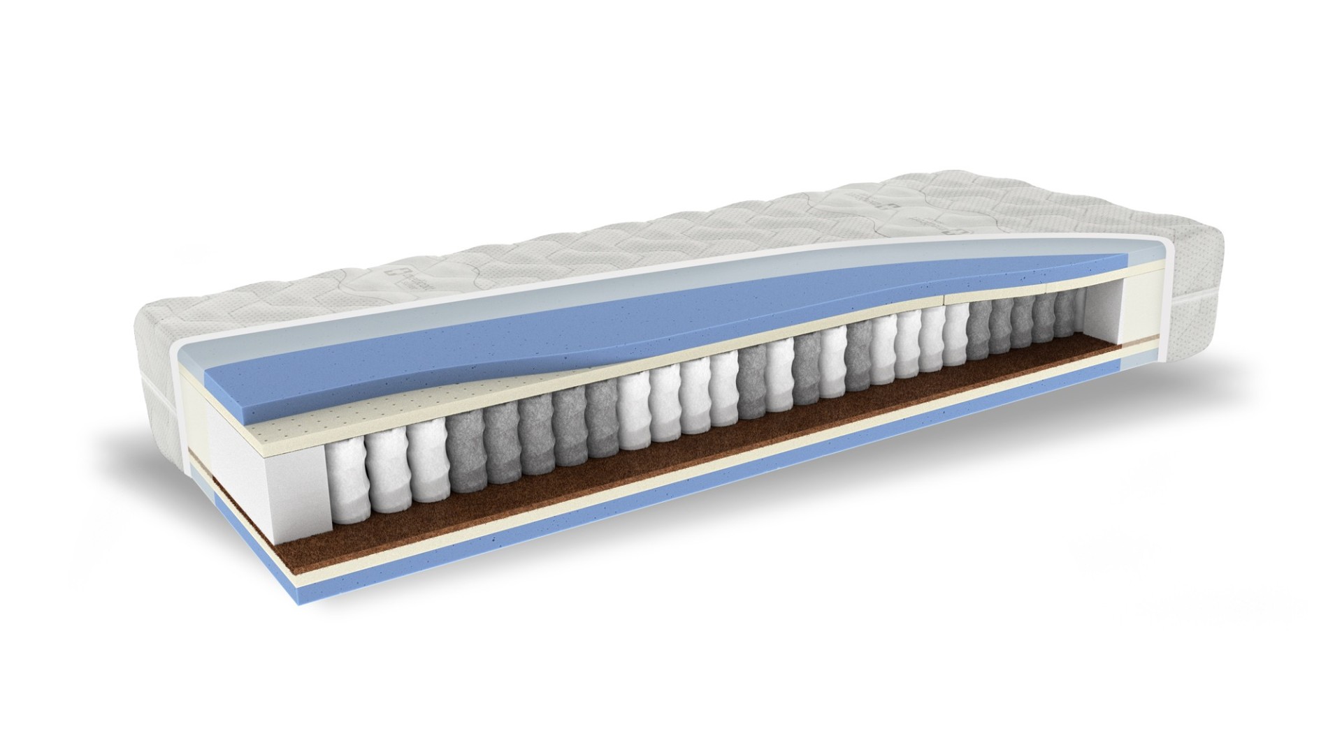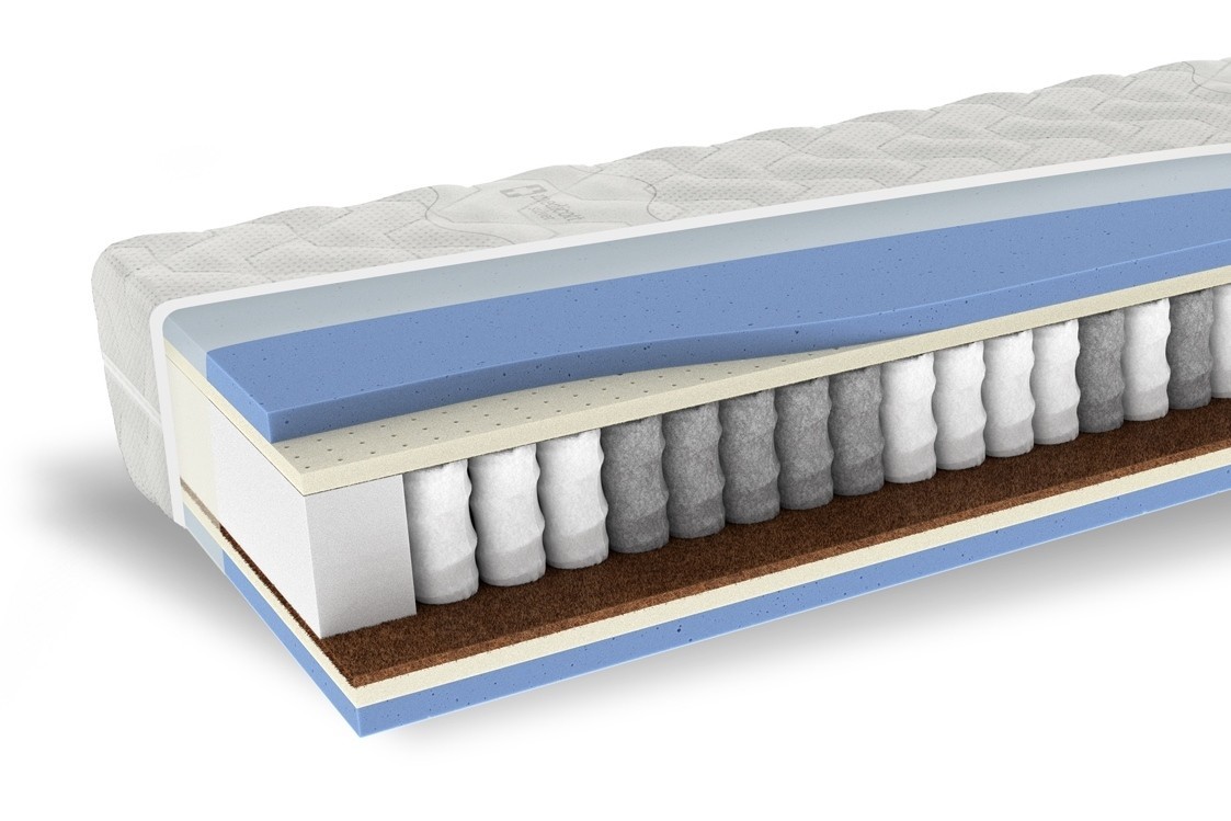 ThermoFresh - hustota 60 kg/m³ LATEXOVÁ PENA PREMIUM - hustota 70 kg/m³ LISOVANÁ BAVLNA – CHRÁNIČ PRUŽINY PUR BOČNÍKY - hustota 35 kg/m³ PRUŽINA PUNKTOFLEX S500 7FYZIO - 250 pružiniek na m² GUMOKOKOS - hustota 80 kg/m³ ThermoFresh - hustota 60 kg/m³ LATEXOVÁ PENA PREMIUM - hustota 70 kg/m³ ELASTICKÁ TEXTÍLIA NA OCHRANU JADRA SNÍMATEĽNÝ A PRACÍ POŤAH