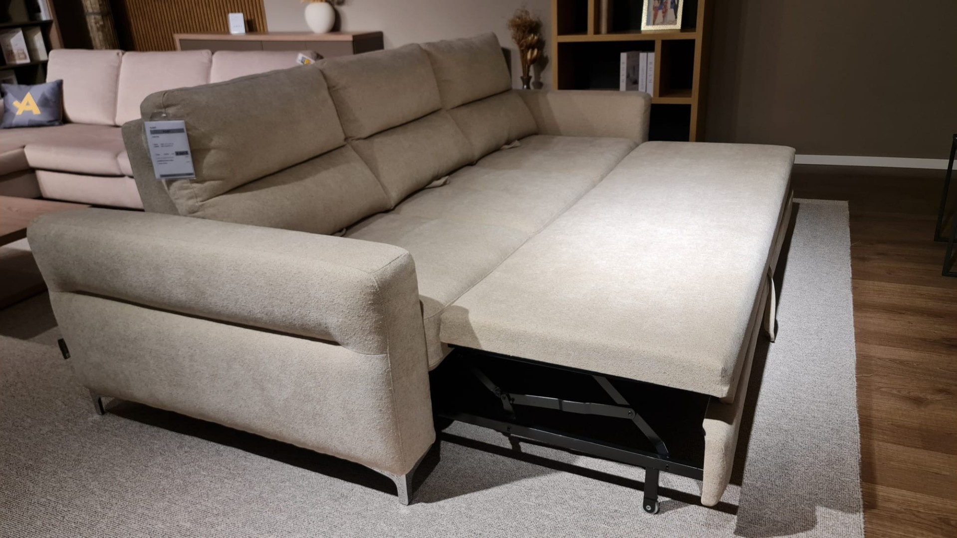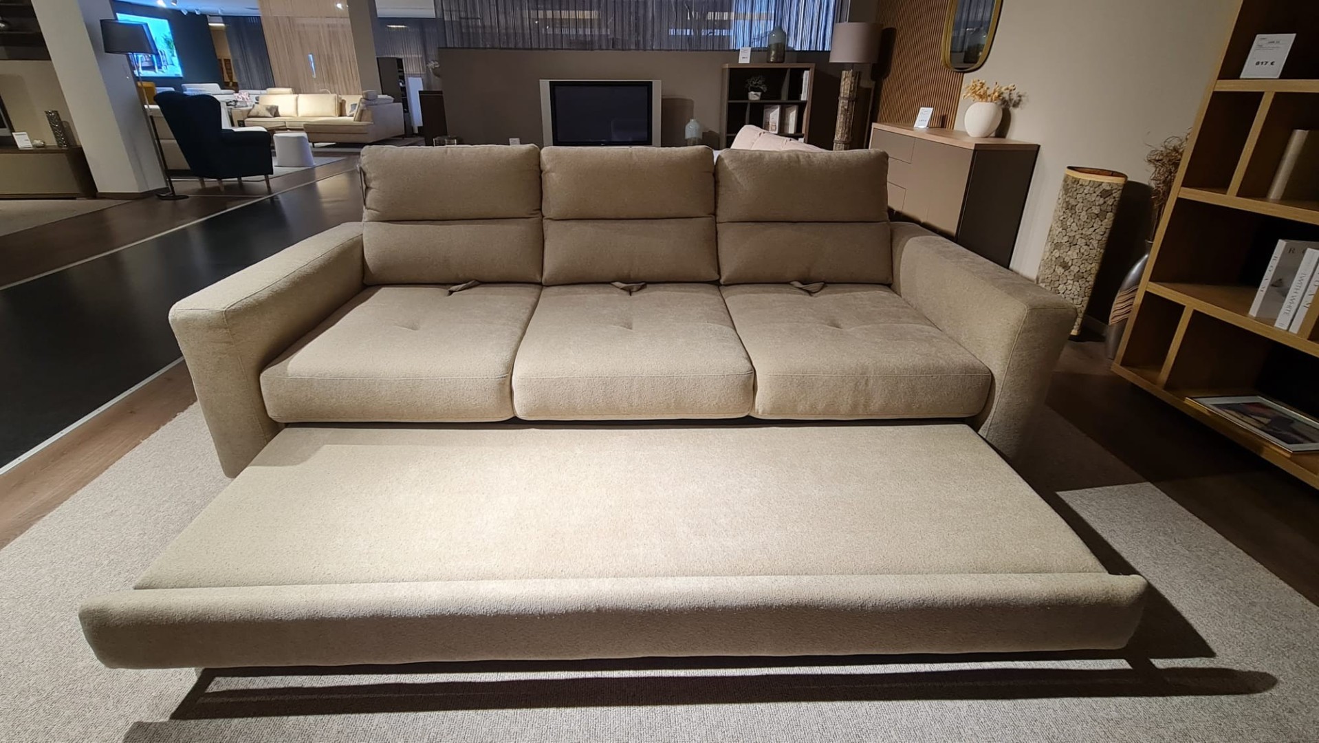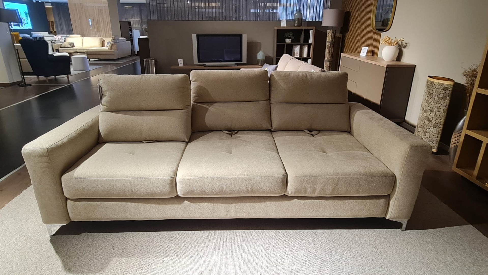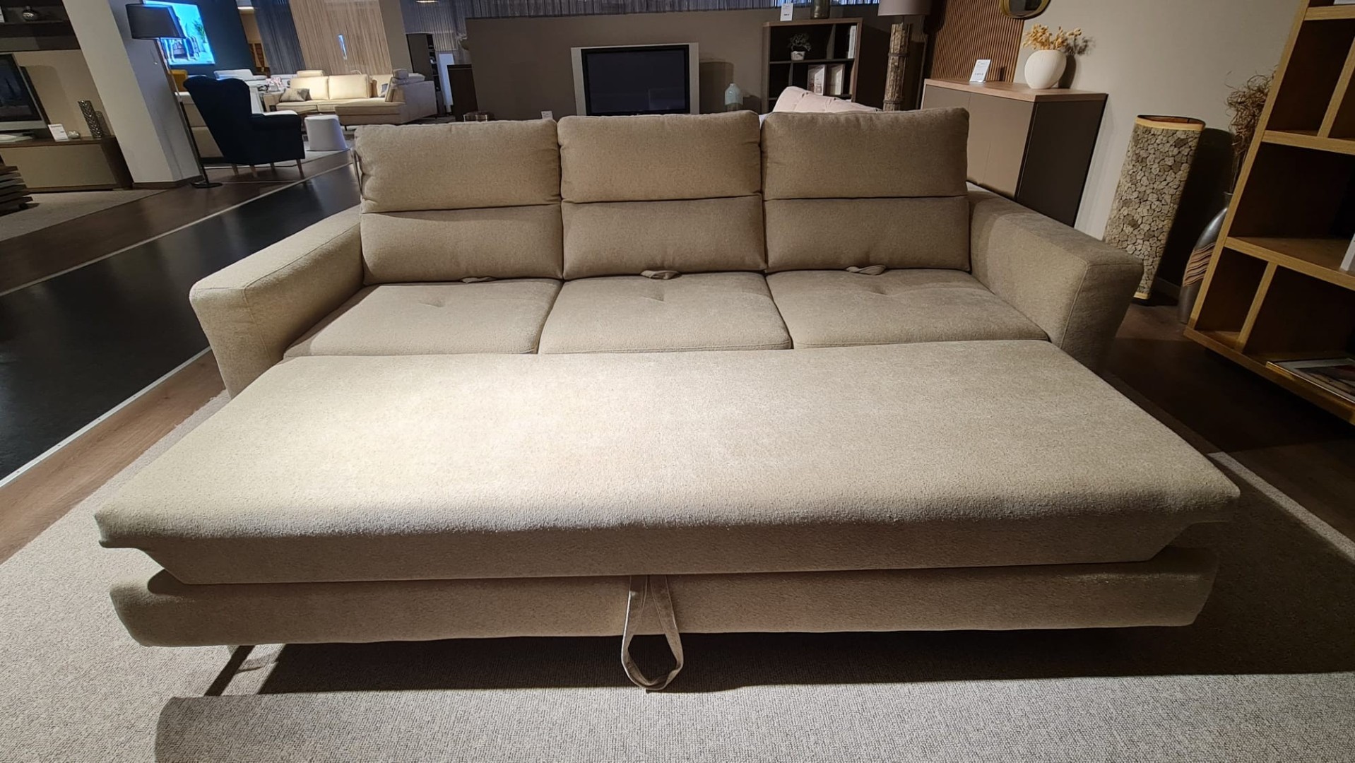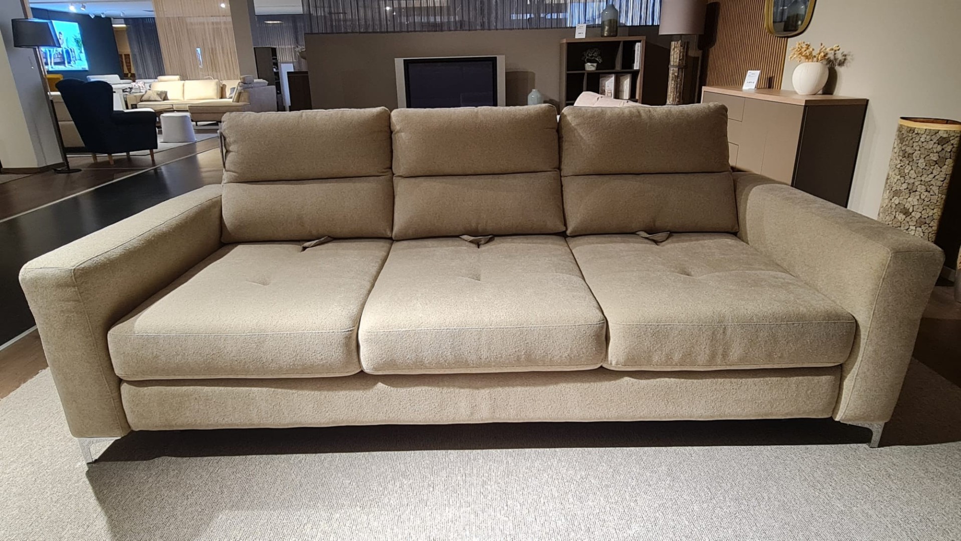 Sedačka od talianskeho výrobcu v prevedení trojsedu je čalúnená v jemnej maslovej farbe. Kovové lesklé nožičky. Mäkké opierky chrbta, nastavenie hĺbky sedu a rozklad na lôžko.