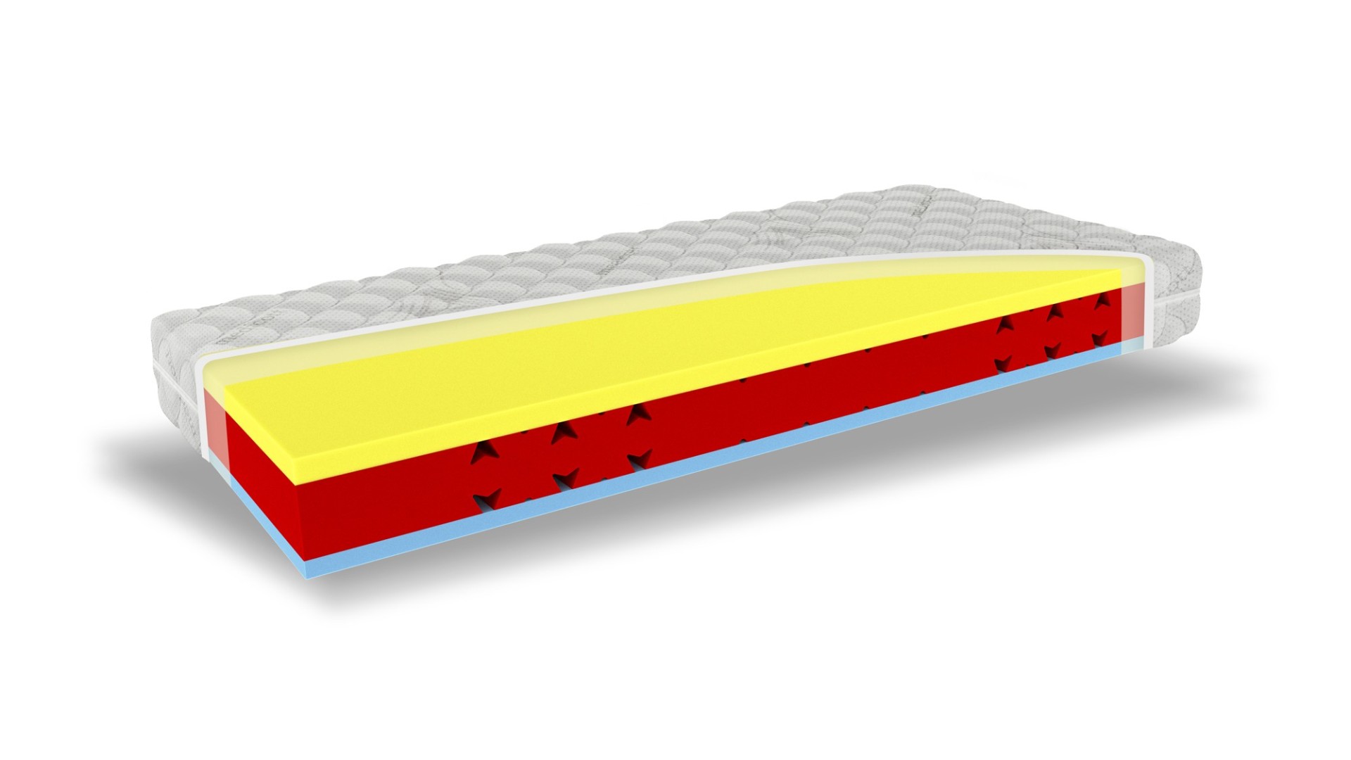 Antibakteriálny ortopedický matrac so švajčiarskou penou SANITIZED, ktorá je špeciálne vyvinutá pre výrobu matracov vhodných pre alergikov. Jadro matraca tvorí moderná hybridná pena RED CORE HYBRID so 7 zónami tvrdosti. Matrac je pocitovo tvrdší, ideálny pre tých, ktorí potrebujú pevnú oporu chrbtice. Vďaka anatomicky tvarovanému jadru je však oblasť pod ramenami a kolenami mäkšia, čo zvyšuje komfort pri spánku. Zóna pod chrbtom a bedrami zostáva pevná a stabilná, aby bola zabezpečená správna poloha chrbtice počas celej noci.