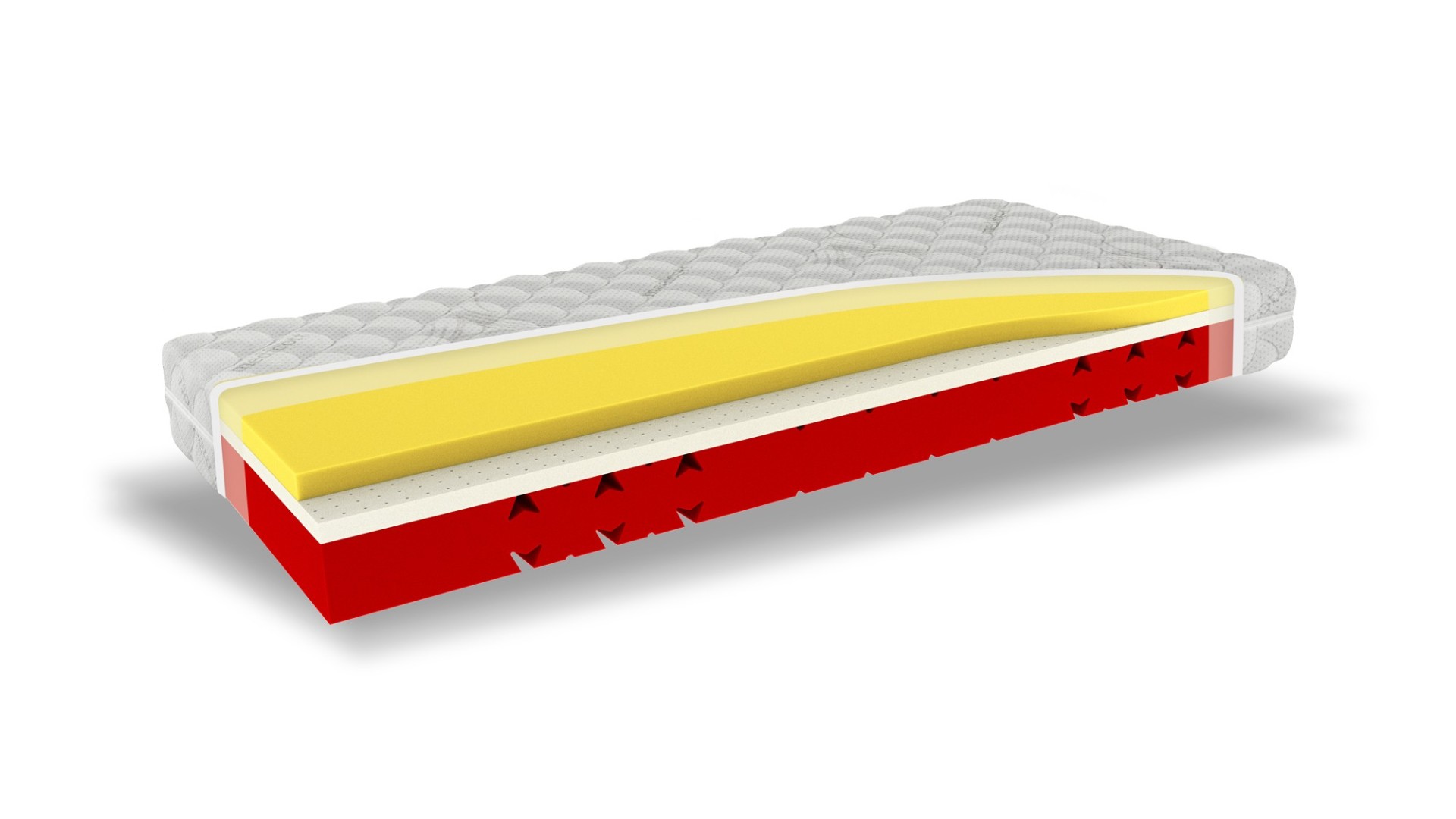 Ortopedický matrac s pamäťovou penou MEMORY, latexovou penou PREMIUM a nosným jadrom z hybridnej peny RED CORE HYBRID so 7 anatomickými zónami. Ideálna voľba pre tých, ktorí hľadajú dokonalú oporu tela, úľavu pre kĺby a svaly a stredne tvrdý pocit spánku. V oblasti ramien a kolien je matrac vďaka zónovému jadru mäkší, aby vaše kĺby mohli dokonale relaxovať bez nepríjemného protitlaku