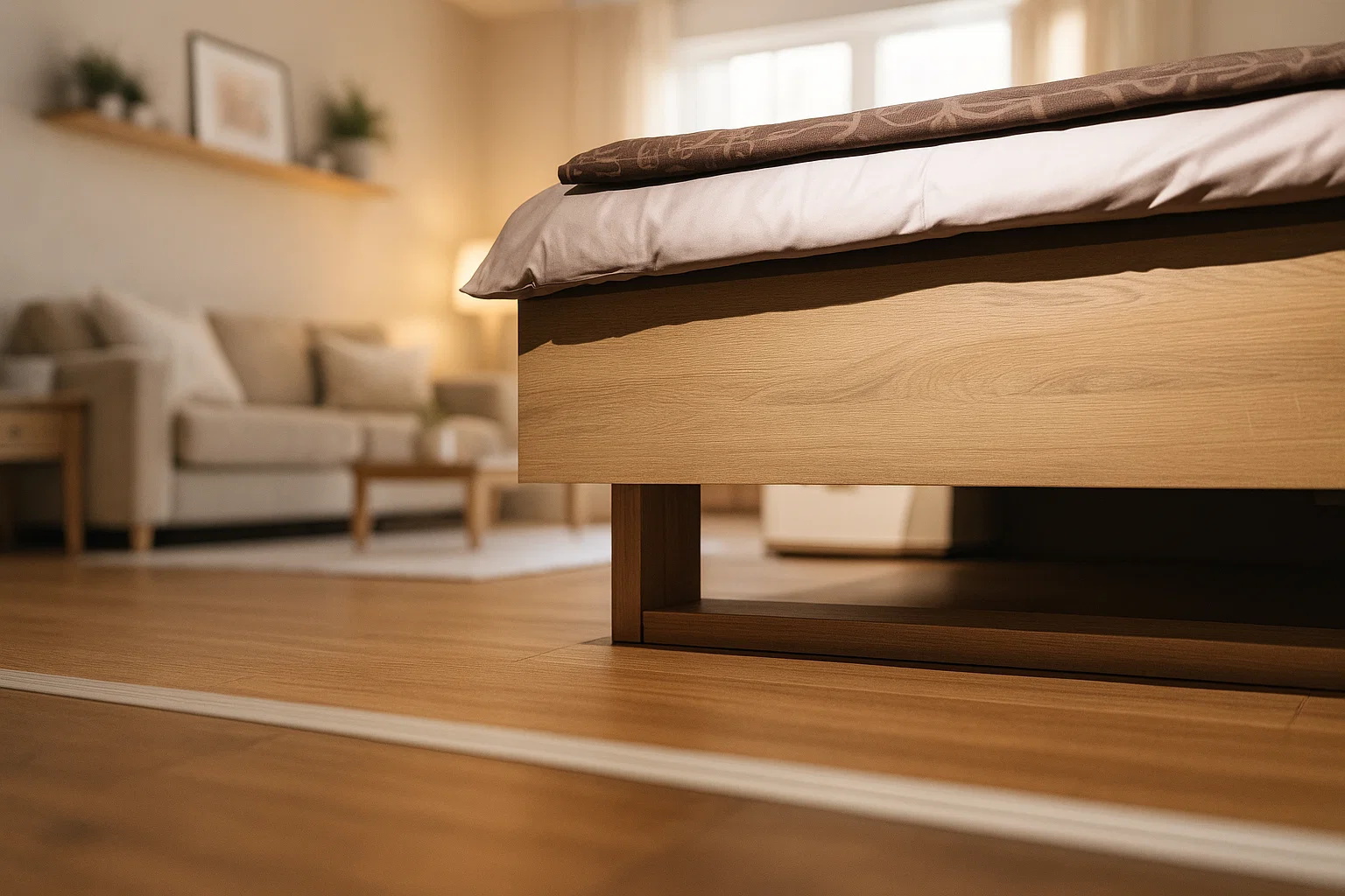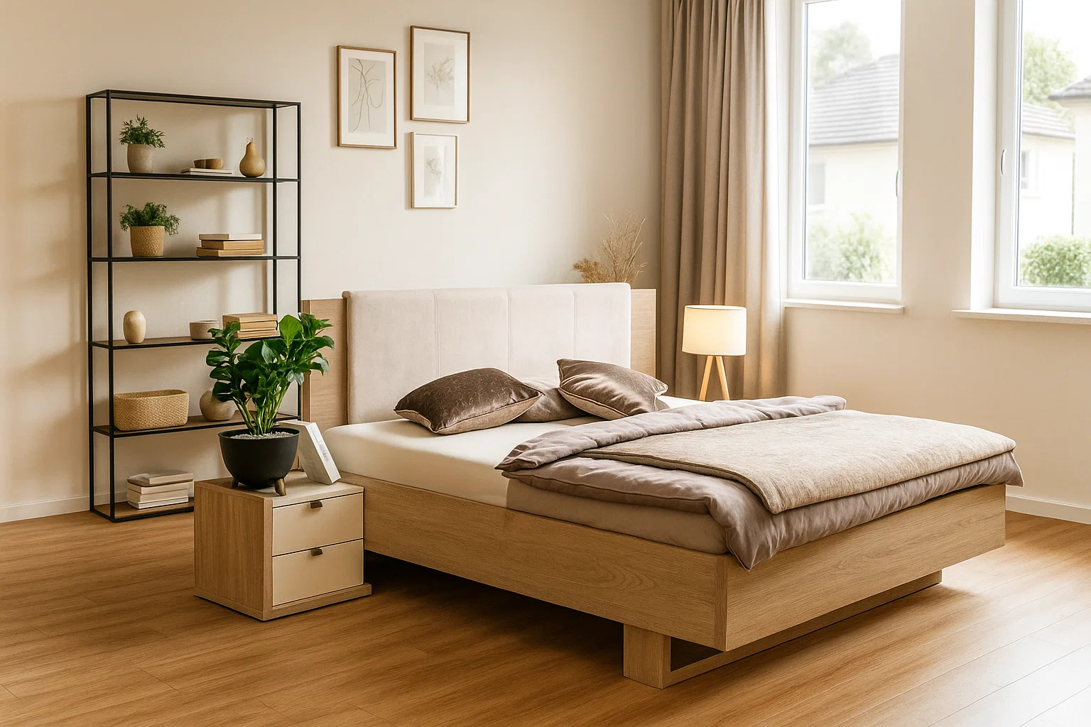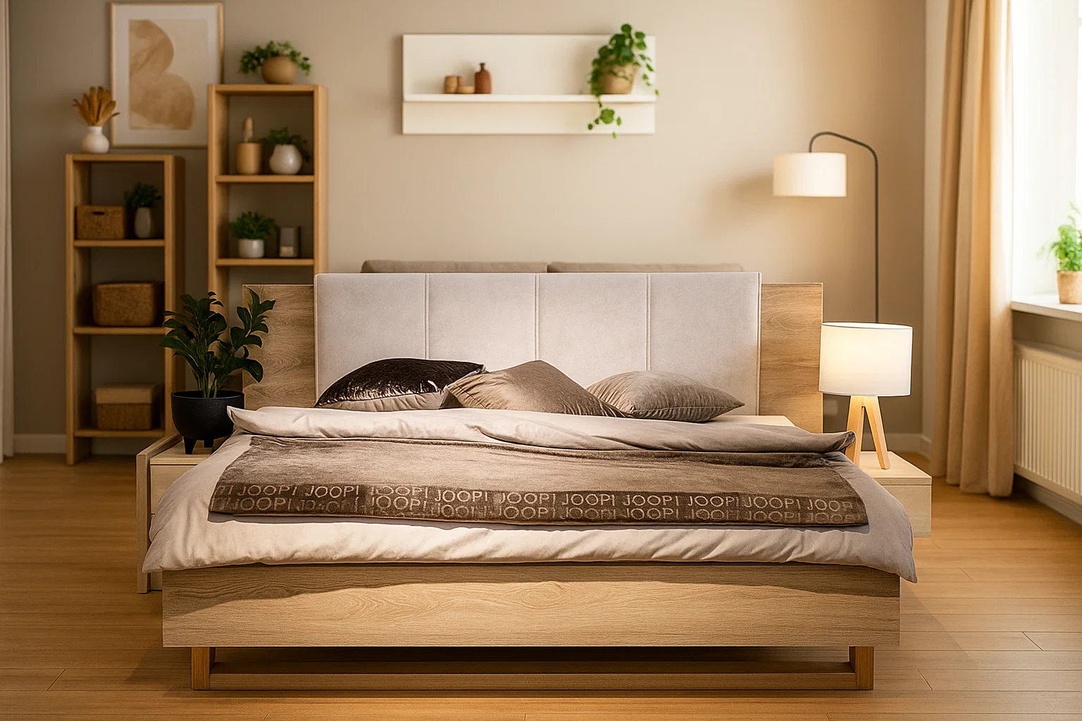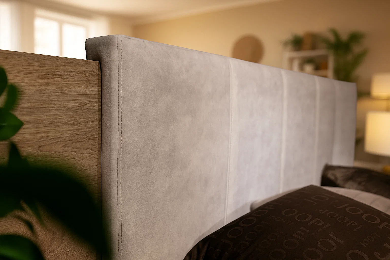 Drevená posteľ na vyššej podnoži s čalúneným čelom ponúka odľahčený dizajn a originálny vzhľad. Umožňuje jednoduché upratovanie a je ideálna do spálni s podlahovým kúrením. Posteľ sa vyrába aj v prevedení s úložným priestorom.