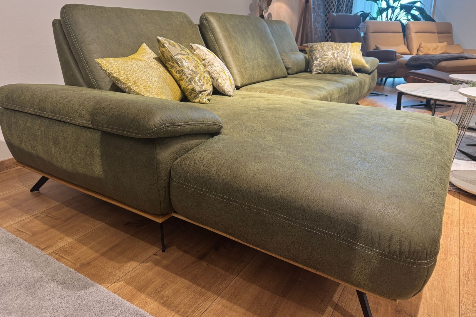 Elegantná rohová sedačka na vysokých, šikmých nožičkách