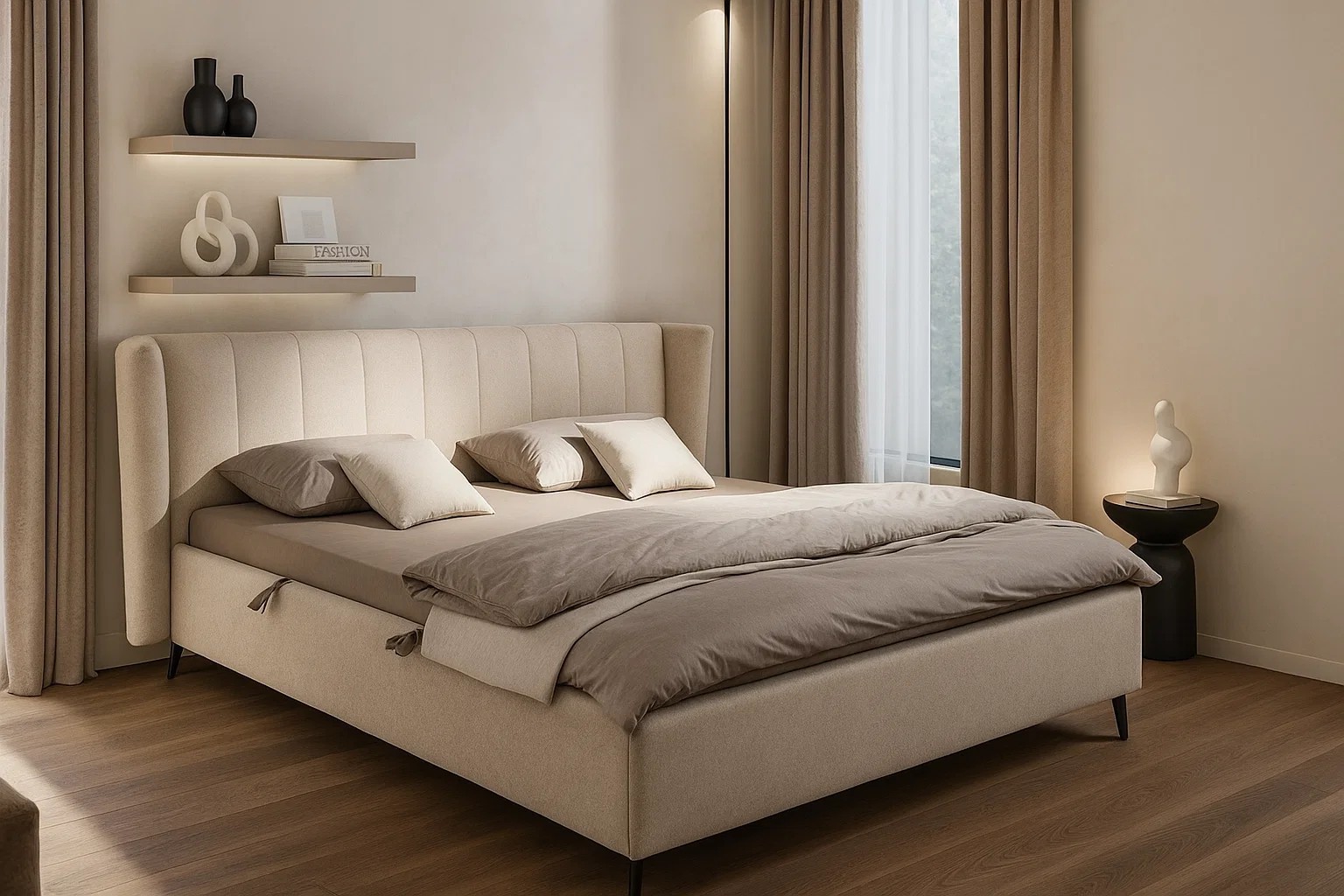Čalúnená posteľ s úložným priestorom a pohodlnými vyklápacími roštami, teraz v akciovej cene. Zvislé prešívanie na čele spolu so zaoblenými bočnými okrajmi dodáva posteli výnimočný vzhľad. Praktický úložný priestor poskytne miesto na všetky vaše lôžkoviny aj sezónne veci.
