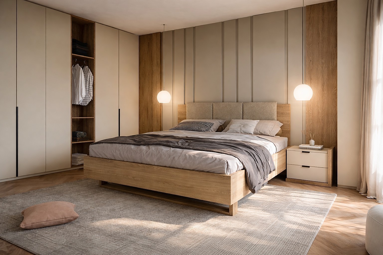 Drevená posteľ na vyššej podnoži s čalúneným čelom ponúka odľahčený dizajn a originálny vzhľad. Umožňuje jednoduché upratovanie a je ideálna do spálni s podlahovým kúrením. Posteľ sa vyrába aj v prevedení s úložným priestorom.